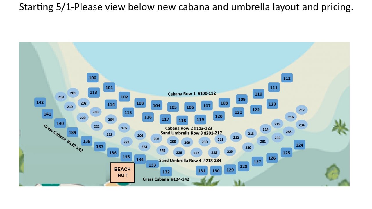 $100.00 + tax (price change starting 5/1, please also view new cabana and umbrella map layout)